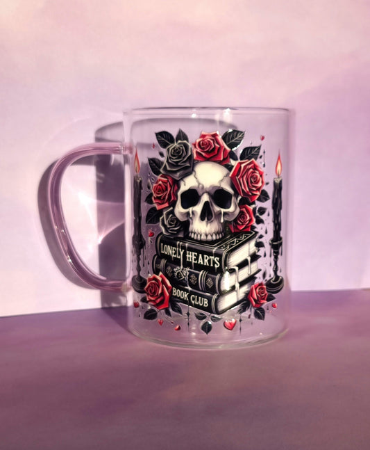 Lonely Hearts Bookclub Glass Mug with pink handle